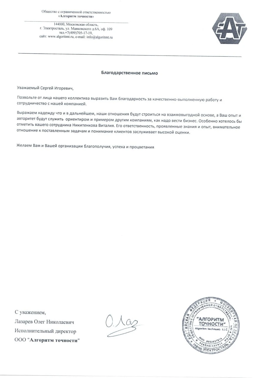 Выражаем надежду что и в дальнейшем, наши отношения будут строиться на взаимовыгодной основе, а Ваш опыт и авторитет будут служить ориентиром и примером другим компаниям, как надо вести бизнес. Особенно хотелось бы отметить вашего сотрудника Никитенкова Виталия. Его ответственность, проявленные знания и опыт, внимательное отношение к поставленным задачам и понимание клиентов, заслуживает высокой оценки.